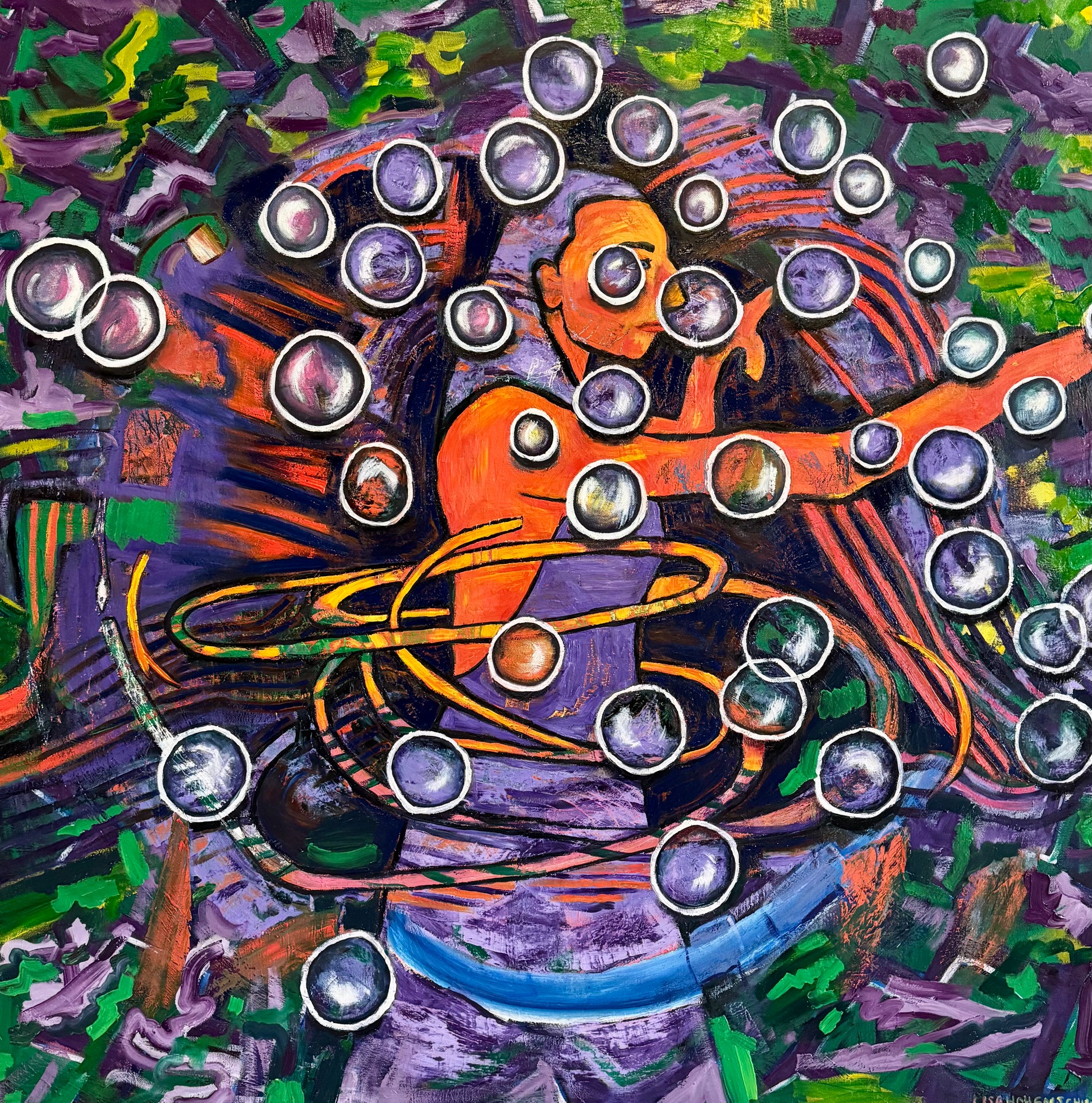 Trouble is an iconic Hula Hooper. There was a lot of rage and big emotions that went into this painting that arrives in the form of motion.