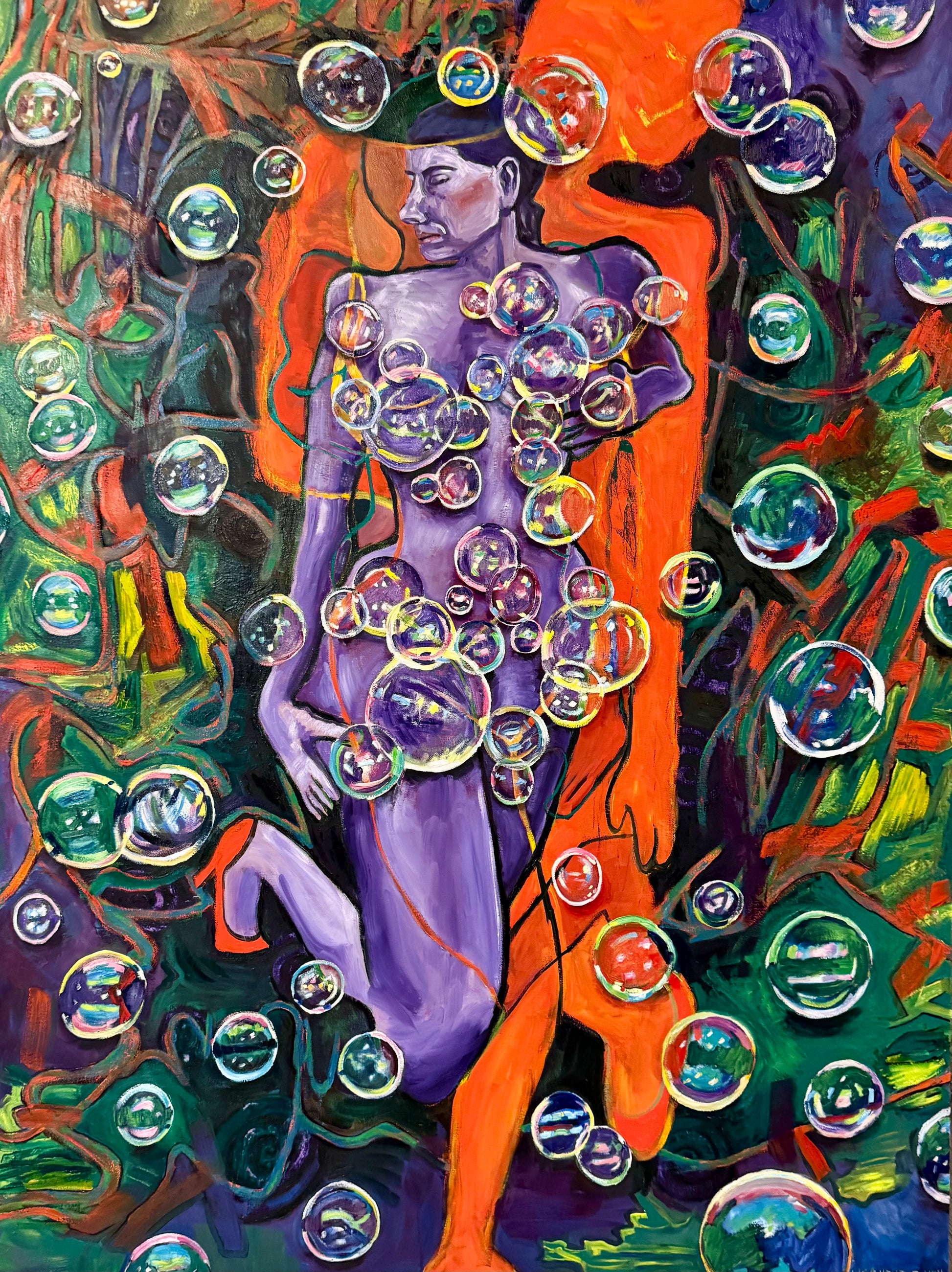 She is everything I wanted for her. She is colorful and beautiful. The cool and hot colors deeply contrast to give a perfectly balanced experience of both verging on mania and descending into depression. She is a troubled mind that cannot look forward. Surrounded by the bubbles of life, the woman wills herself to continue so she can find their meaning.
