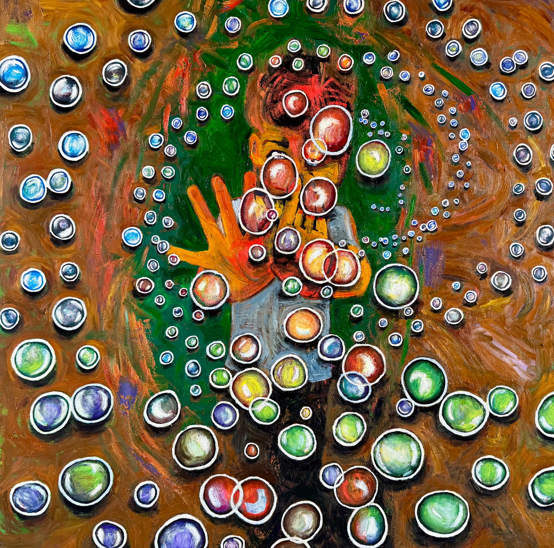 In this piece, Swirls around. You can see a figure. The artwork is daring and wide-eyed with complex imagery—the detailed, tiny orbs swirl around the center in a dynamic, flowing composition. This piece is of a boy and his hands. This boy was one of my students in the youth art program at Prison Family Alliance. 45% of Americans have had a loved one incarcerated. PFA supports the people who are going through this. Half the money from this piece goes to the non-profit Prison Family Alliance.