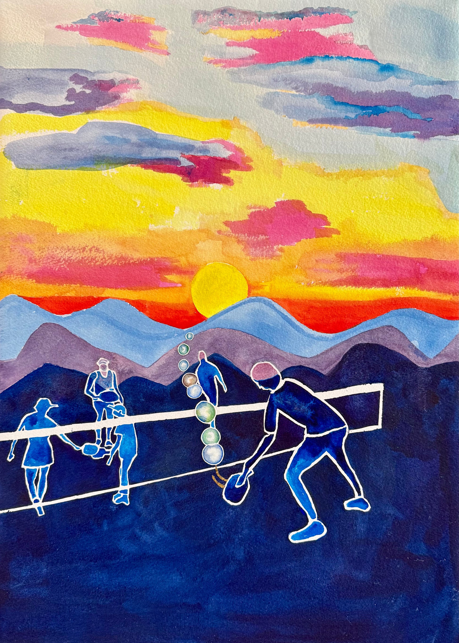 This painting with striking blue mountains and a bold focal point is perfect for any pickleball fan. Pickleball players enjoy their game into the twilight hours. The deep blue hills contrast the vibrant orange and pink skies, giving the sense that these players will soon be in darkness.